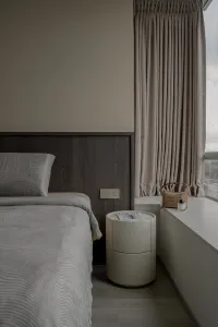 Spatial fluidity is so prevalent in this space, especially when you move into the master bedroom. Same neutral tones echo through, and the furniture is kept minimal and bare with a bay window seat to overlook the city, highlighting the natural aesthetics they are built with. It's a complete chill-out energy where you’re just calm and present here.